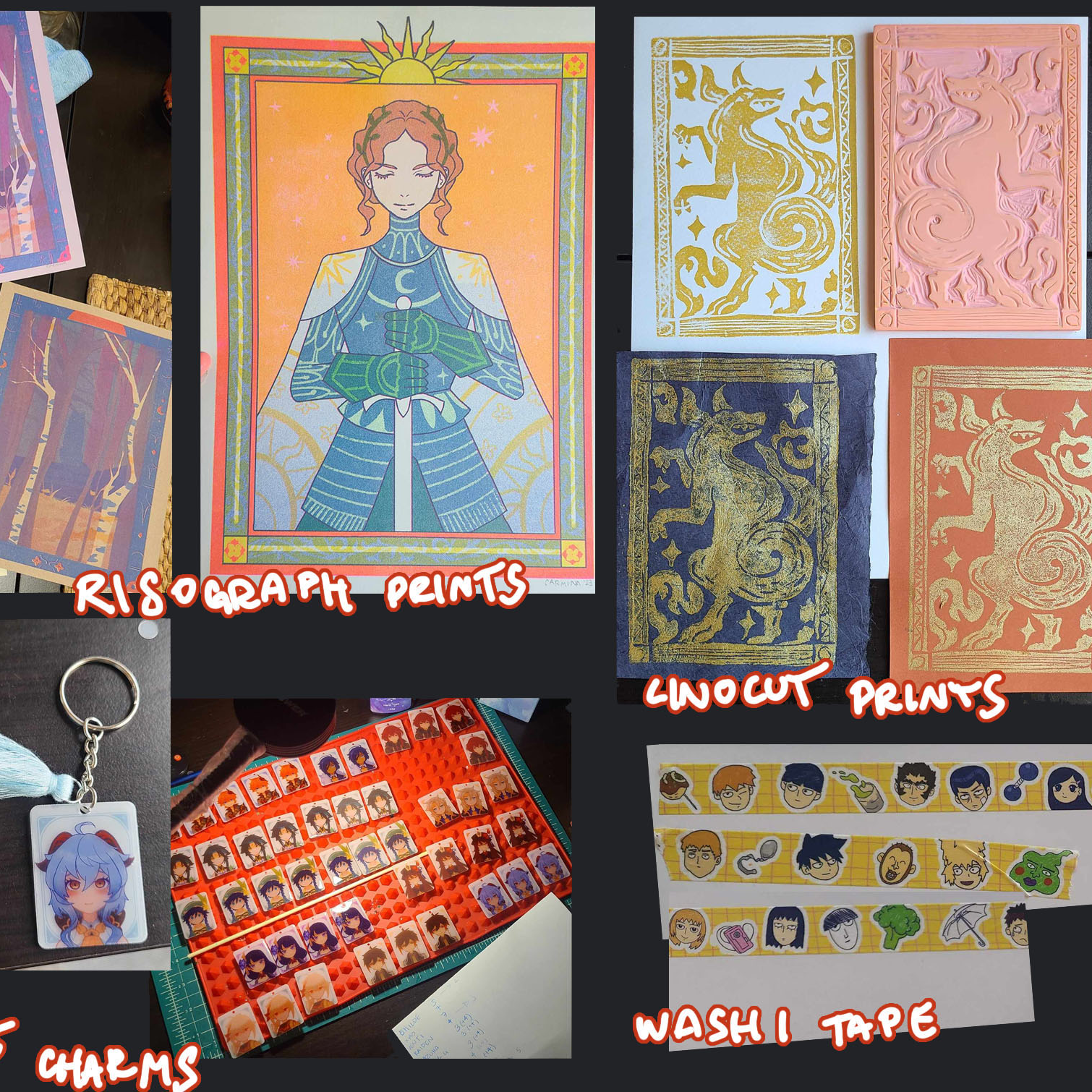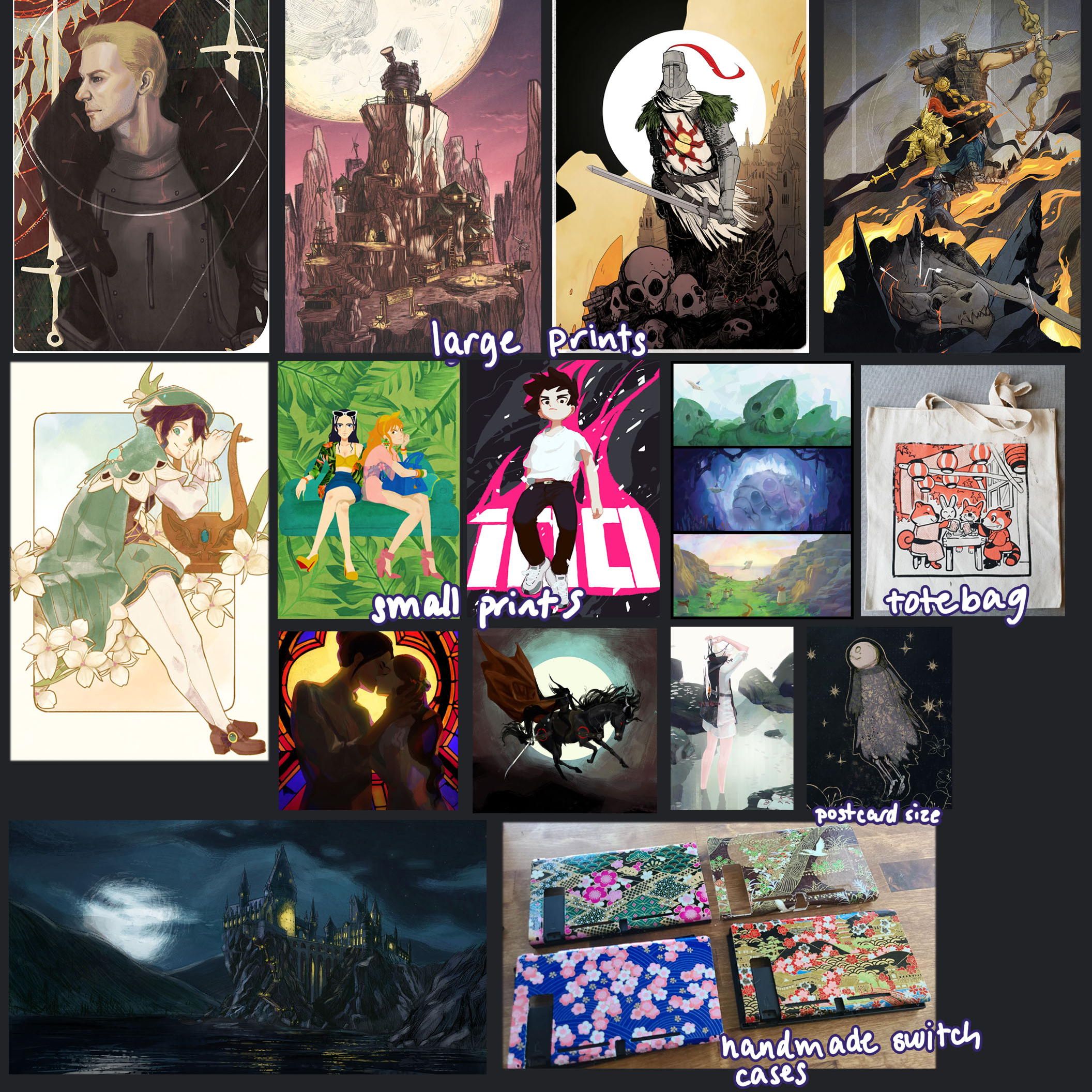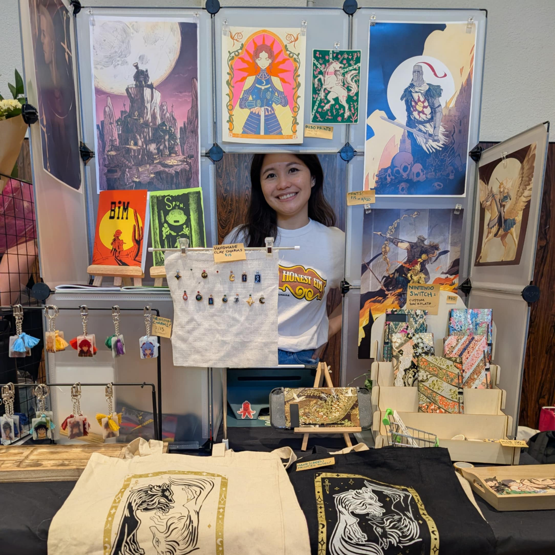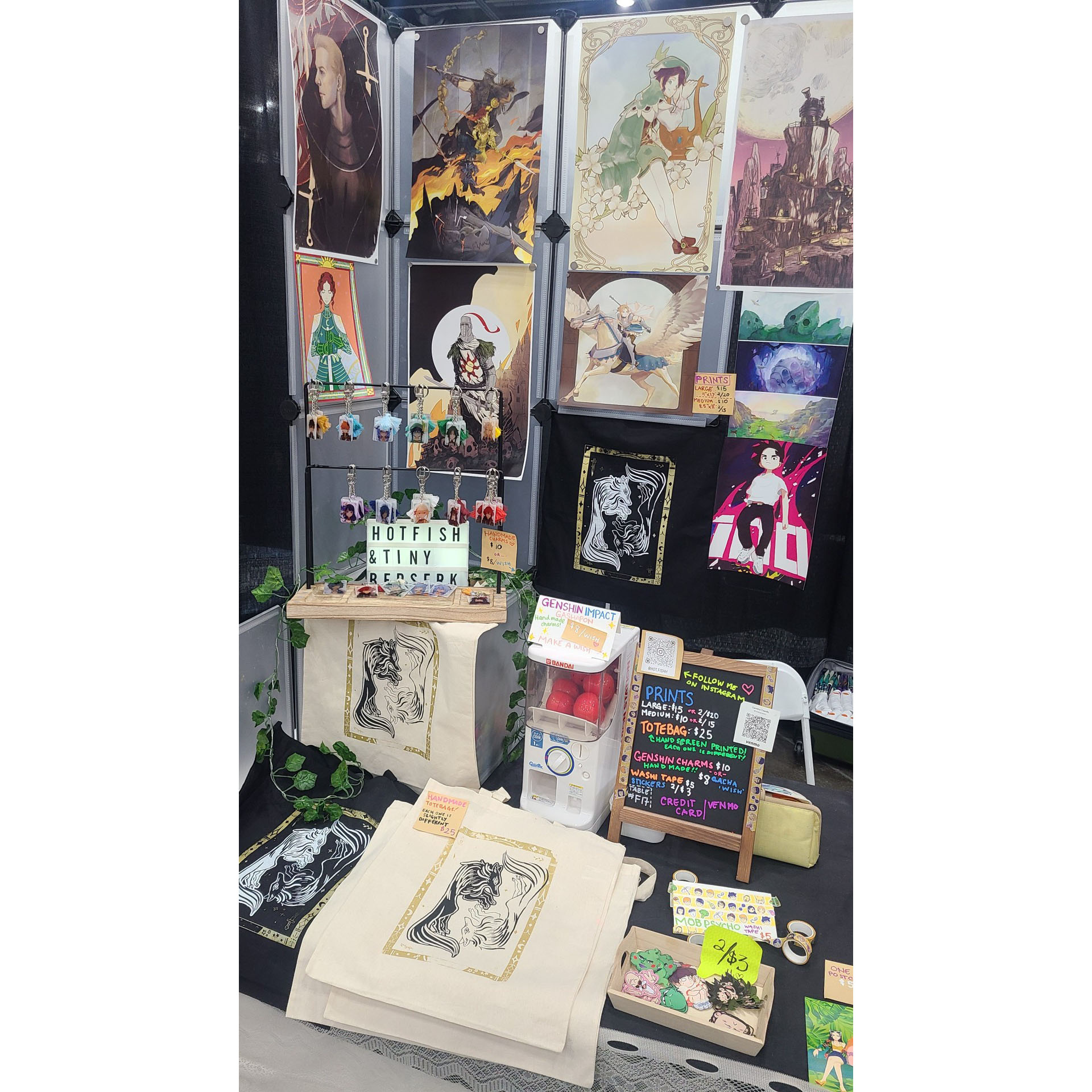 hotfish creates fantasy-inspired art and fanart, with video games as their fandom of choice. At conventions, hotfish sells prints, hand screen-printed tote bags, and handmade clay pendant charms.