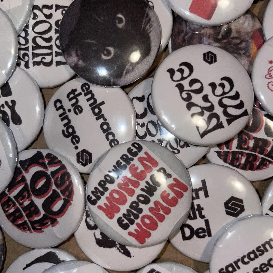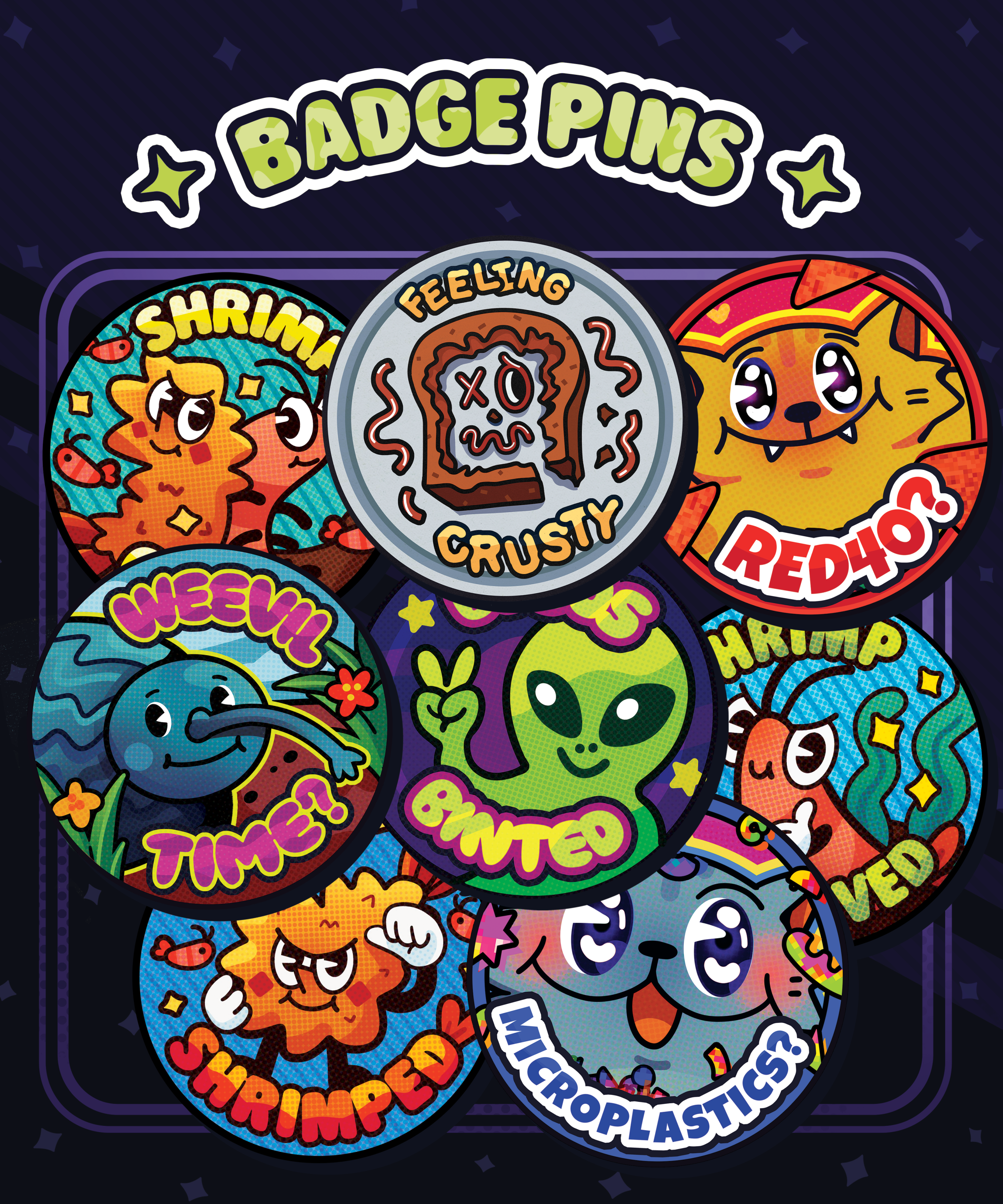 Funky colors, wacky quotes, retro vibes! Tempura Mayo is a designer that makes stickers, keychains, pins, and other fun knick knacks. They also like shrimp!